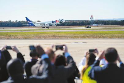 11月8日,运送大熊猫的专机从美国弗吉尼亚州的华盛顿杜勒斯国际机场起飞。 新华社记者 刘杰 摄